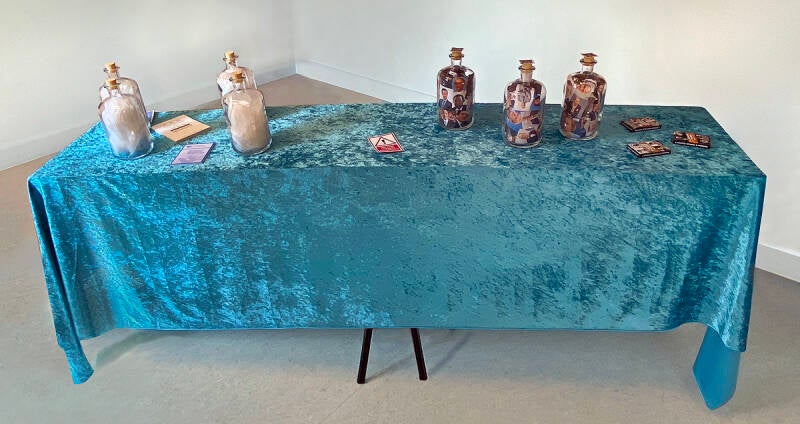 Installation bestehend aus farbig bedruckten Papierseiten hinter Glas, farbige Schottersteine auf Glasplatte geklebt, Kunstrasen auf Glasplatte geklebt.