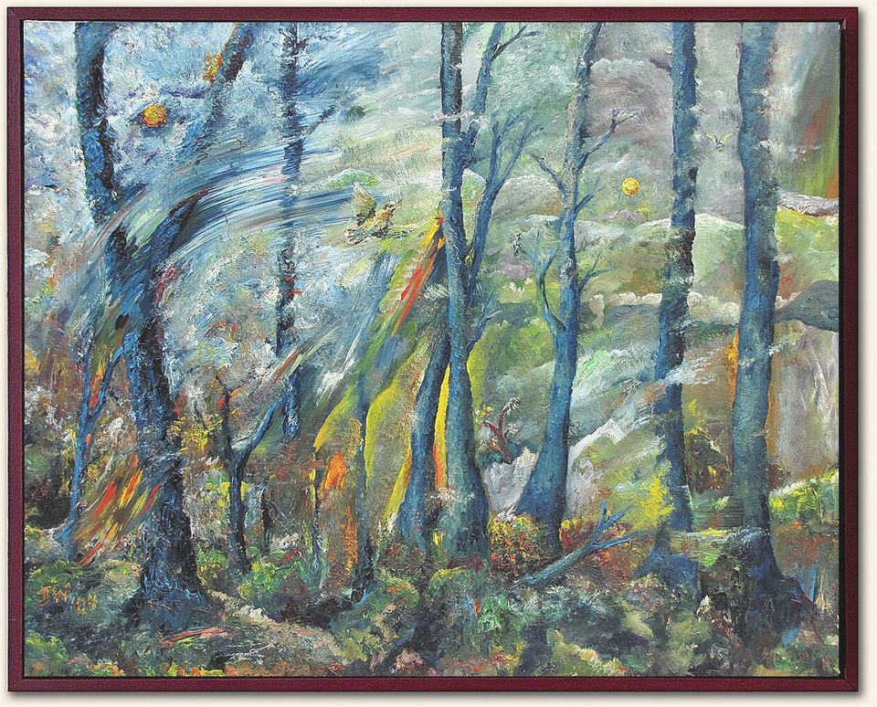 Das Ölgemälde nahm Gestalt an und es entwickelte sich eine fiktive Waldlandschaft und in Gedanken reiste ich in ein Reich der Mythen und Sagen. Und plötzlich war er da, der "Feuervogel", flog in meiner Fantasie einfach mitten durch den Wald und nun war klar, dass ich den Bäumen aus Preußisch-Blau ein loderndes Gelb und Rot eines Feuers entgegenzusetzen hatte. So fing der Wald Feuer und es glimmte hier und loderte dort, überall, wo der Feuervogel entlang flog, brannte es. Der "Feuervogel", von dem die Menschen sagen: "Wo er auftaucht, wird Feuer lodern". Und über allem Geschehen ruhen noch zwei Planeten, stellvertretend für eine andere Welt, "irgendwo da draußen", wo es vielleicht keinen Feuervogel, aber ein anderes fabelhaftes Wesen gibt.