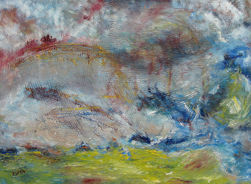 Wo sich die Elemente Erde und Wasser begegnen. In dem Ölgemälde "Sommerregen" (Abbildung oben) ist keine konkrete Form dargestellt. Der Kontrast zwischen dem hellen, statischen Grün der Landschaft und einem bewegten und bewegendem Blau-Weiß-Grau des Wassers unterstützt die Bildkomposition. Über allem die Akzente der Luft, in Gelb- und Rottöne gesetzt. So ist das Dargestellte nicht greifbar, nicht stofflich, drückt aber dennoch eine schöne, abstrahierte Stimmung aus.
